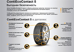 Шина Continental ContiEcoContact 5 — предназначенная для легковых автомобилей. Разработана с учетом потребностей автовладельцев, совершающие длительные поездки: сопротивление качению снижено на 20%, ходимость увеличена на 12% по сравнению с моделью предыдущего поколения.